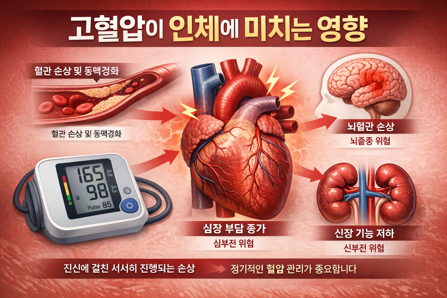 이 글에서는 일반적으로 알려진 의학 정보를 바탕으로, 고혈압이 인체에 어떤 영향을 미칠 수 있는지와 장기간 혈압 상승이 지속될 경우 혈관과 주요 장기에서 나타날 수 있는 변화를 정보 제공의 목적으로 정리하였습니다. 고혈압을 조기에 인식하고 관리하는 것이 왜 중요한지 이해하는 데 도움이 되는 내용을 중심으로 설명합니다.
